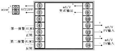 輸出方式為繼電器正反轉(zhuǎn)輸出,PV輸入類型為4~20 mA,SV輸入類型1~5 V,DC24V供電。