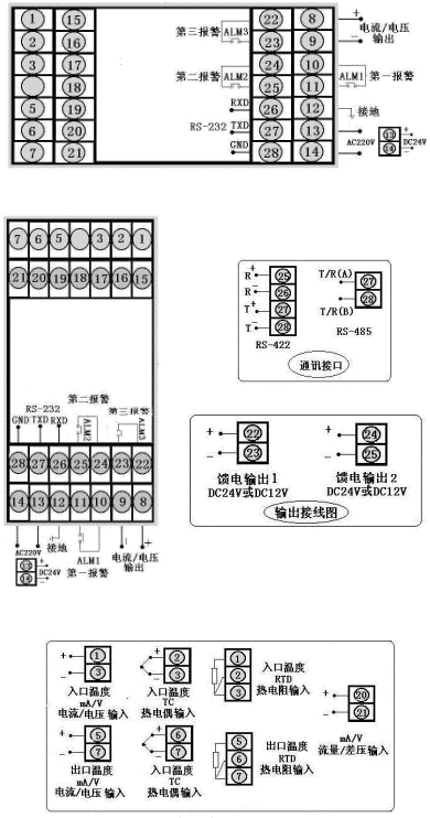 輸出方式為4~20mA輸出,PV輸入類型為1~5 V,SV輸入類型4~20mA,*報警為上限報警,第二報警為下限報警,AC90~265V供電(開關(guān)電源)。